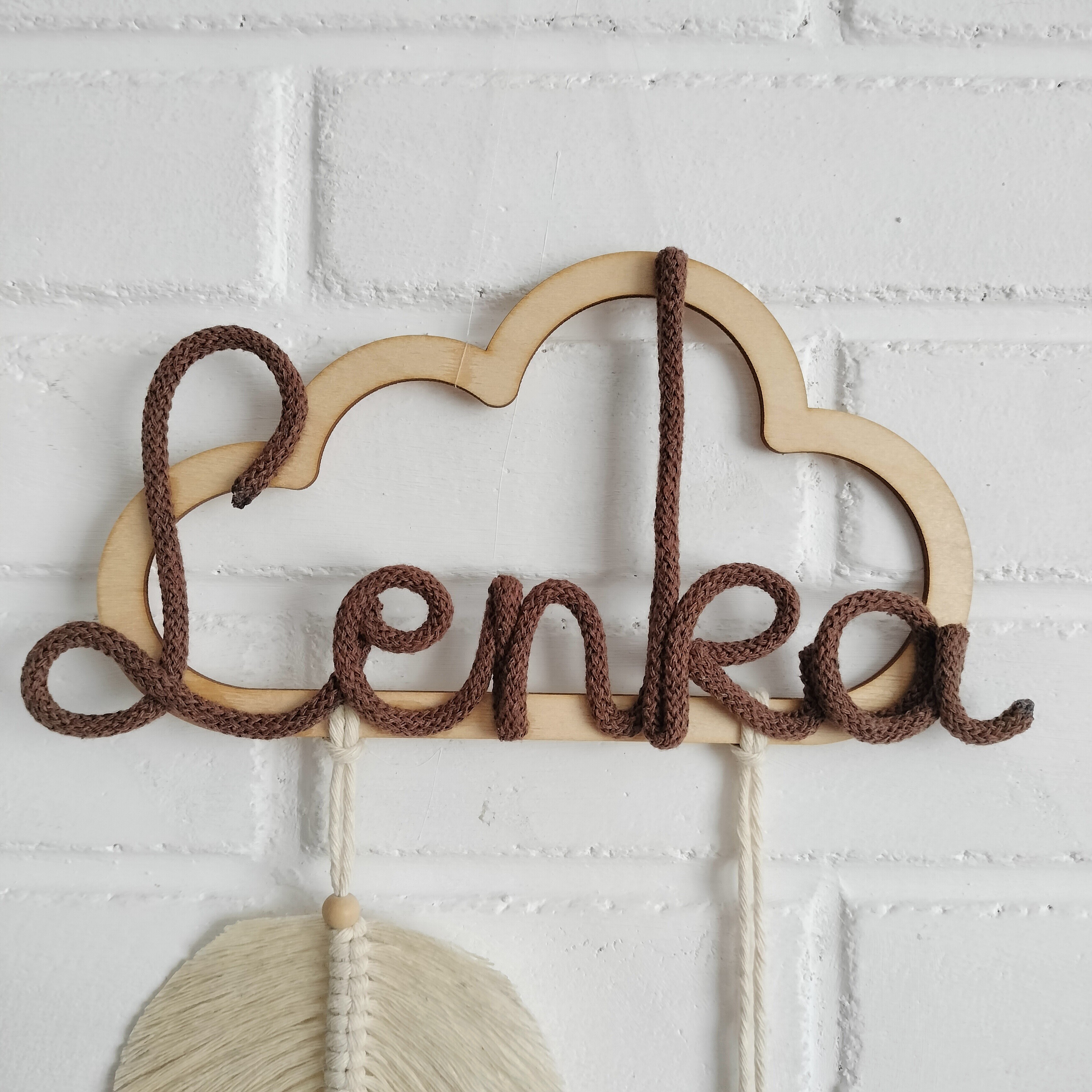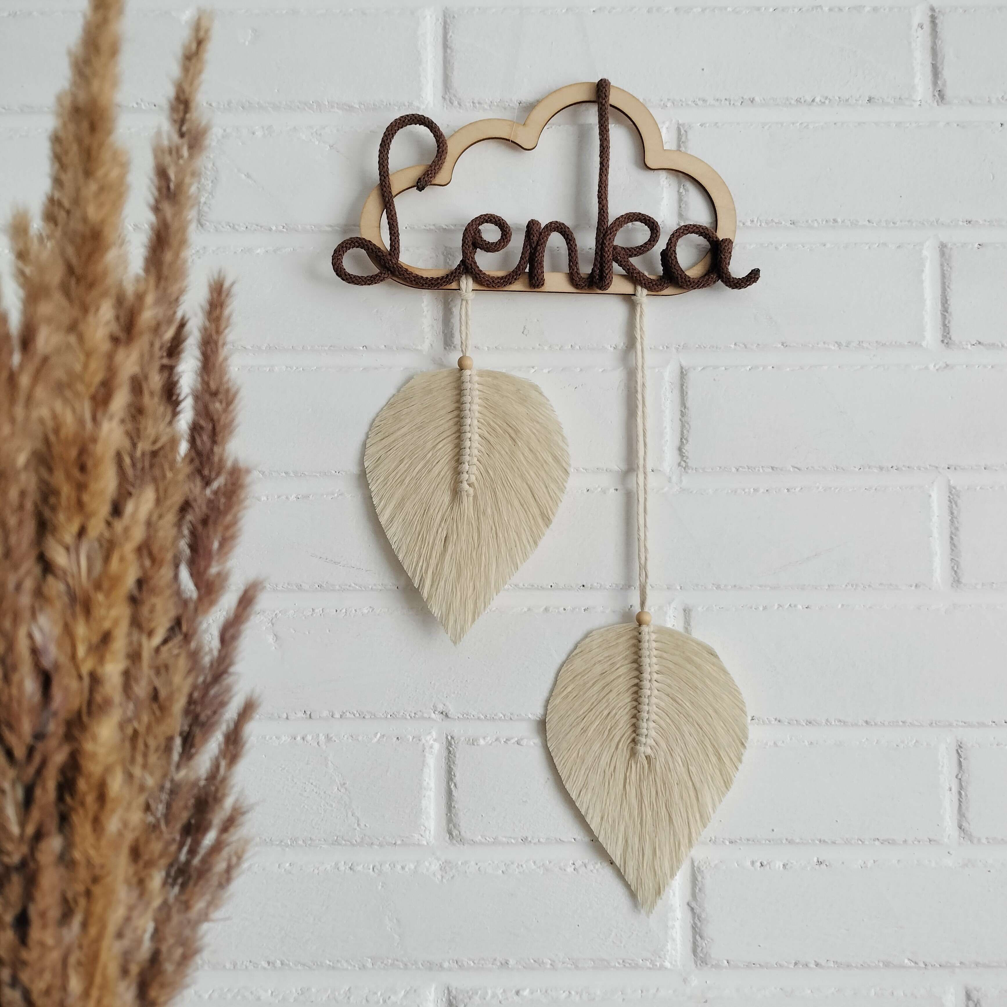 Makrama chmurka z listkami i sznurkowym, dowolnym imieniem