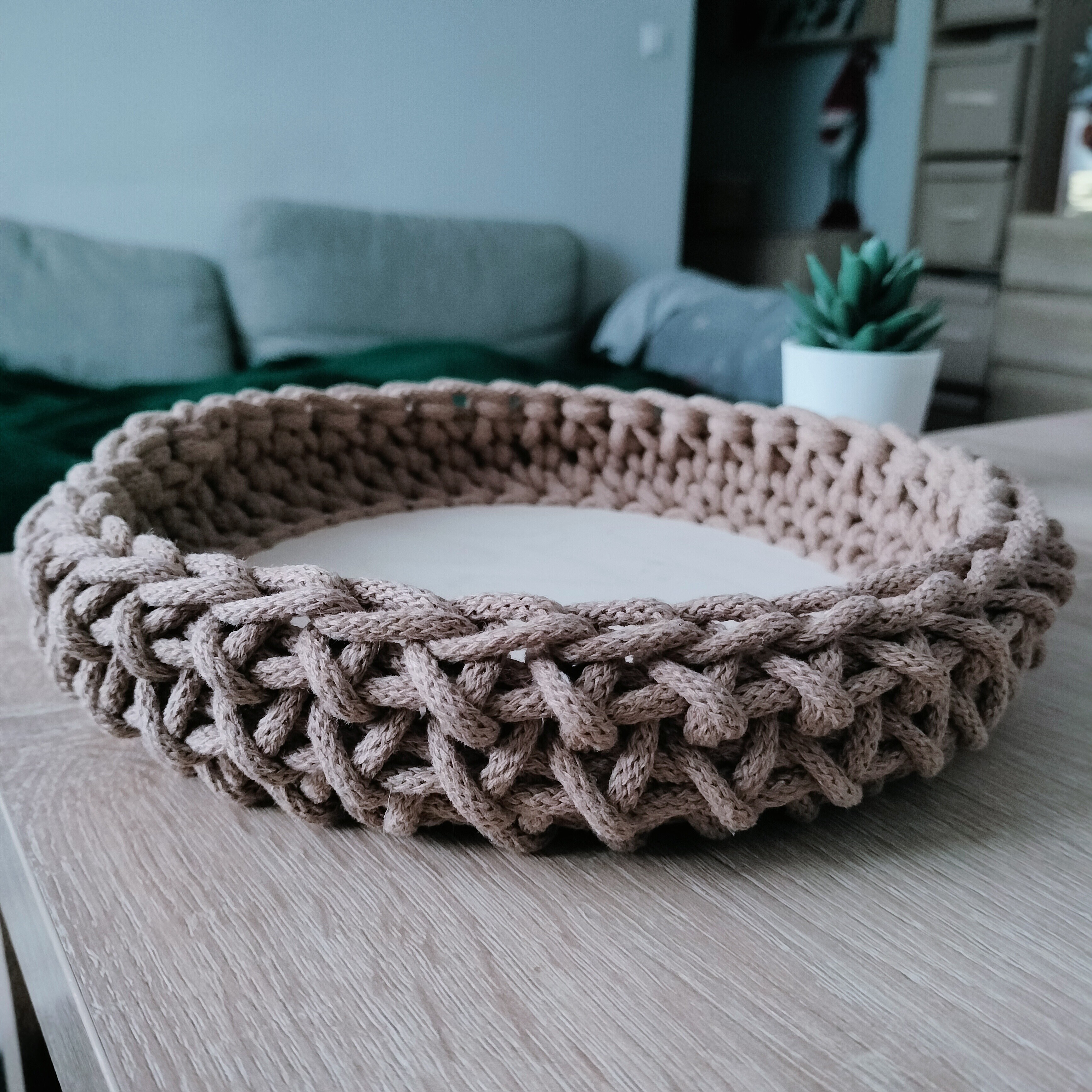 niski koszyk o średnicy podstawy 20cm. może służyć jako taca dekoracyjna na stół lub taca do serwowania.