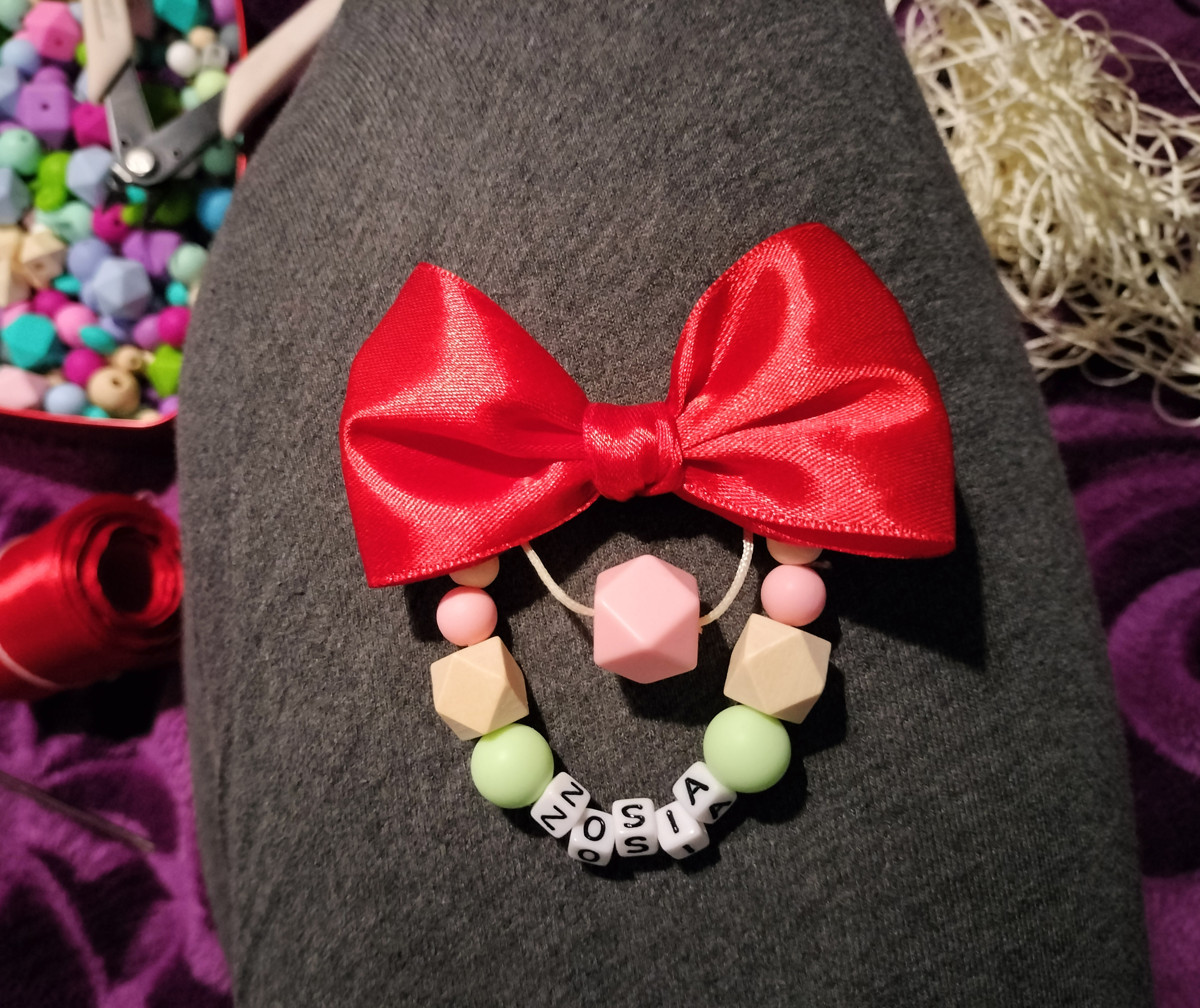 zawieszka wykonana jest z koralików silikonowych oraz z koralików drewnianych, które umieszczone są na sznurku nylonowym.